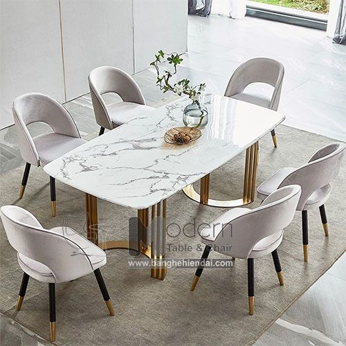 Bàn ăn mặt đá và 6 ghế nệm chân sắt có vuốt col hiện đại