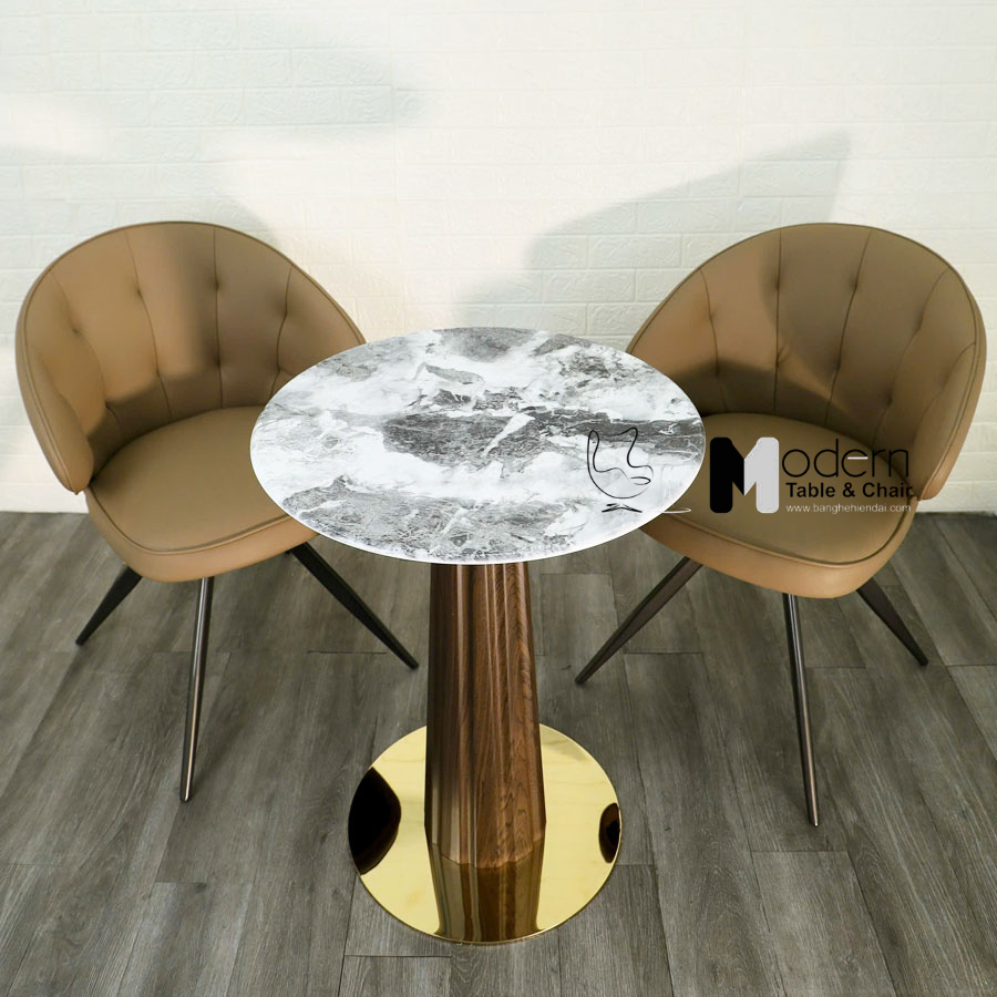 Chất liệu: Mặt đá pha lê nhập khẩu, chân sắt sơn tĩnh điện vân gỗ, đế inox mạ vàng.