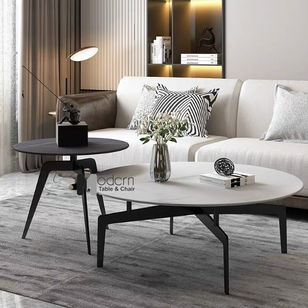 Bàn trà đôi mặt đá phiến tròn chân sắt cho phòng khách (đen – trắng)