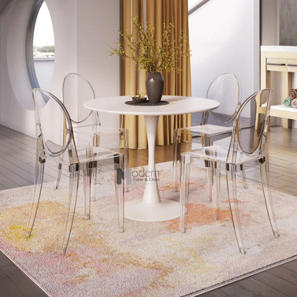 Bộ bàn cafe 4 ghế trong suốt Tulip 2-08W Ghost phù hợp sử dụng làm bộ bàn ăn nhỏ gọn giá rẻ, bộ bàn tiếp khách văn phòng, spa, showroom, bộ bàn cafe nhà hàng, bàn ghế tư vấn,…