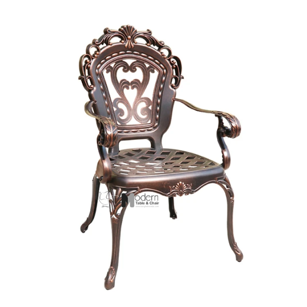 Ghế ăn sân vườn CC2009-A mang lại cảm giác quyền lực tôn quý nhờ thiết kế lưng tựa cao kết hợp với tay tựa dày chắc. Trên bề mặt lưng ghế khắc hoạ tiết hình trái tim cách điệu duyên dáng thu hút những ai yêu thích sự tinh tế lãng mạn. Chất liệu nhôm đúc giúp ghế có trọng lượng vừa phải nhưng chịu được tải trọng lớn. Bạn có thể bố trí thêm nệm ghế để có cảm giác ngồi êm ái. Dưới gót chân ghế có gắn nút nhựa bảo vệ sàn gạch và không gây tiếng kót két khó chịu khi di chuyển.