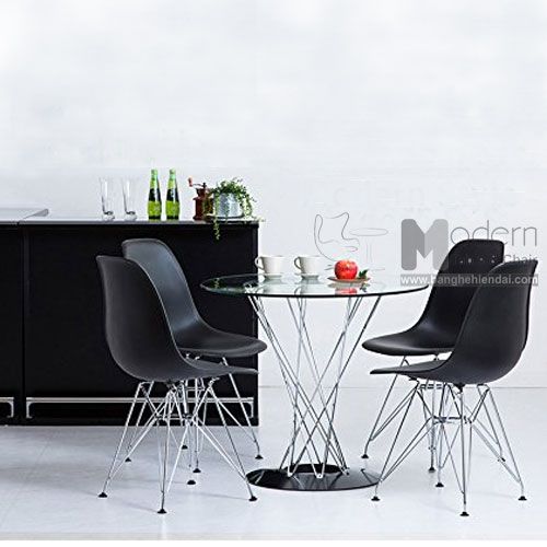 Ghế Eames DSR với thân nhựa ABS chắc chắn sáng bóng với chân thép mạ chrome hình tháp kiểu dáng tinh tế thanh lịch kết hợp với bàn Cyclone A 08G mặt kính cường lực dày 10mm chịu lực, chịu nhiệt, chống trầy dễ dàng vệ sinh.