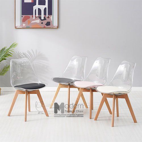 Ghế bàn ăn thân nhựa trong suốt có nệm ngồi bọc simili chân gỗ hiện đại DSW-PC3