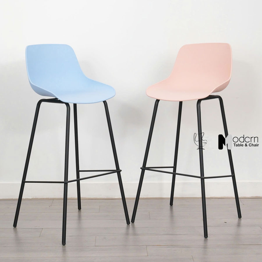 Hai màu xanh dương và hồng mang đến sắc thái tươi sáng, phù hợp với những không gian cần sự sinh động. Kết hợp cùng chân sắt đen, chiếc ghế tạo nên tổng thể hài hòa và dễ phối với các chất liệu như gỗ, đá hoặc kim loại. Dù đặt trong bếp, quầy bar hay cafe, ghế đều giúp không gian thêm phần thu hút.