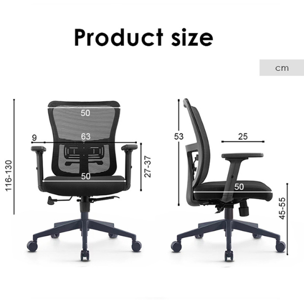 Lưng ghế bọc vải lưới thoáng mát. Nệm vải dày dặn mang đến sự êm ái khi ngồi làm việc trong thời gian dài. Tay ghế tăng giảm độ cao theo tư thế người ngồi.