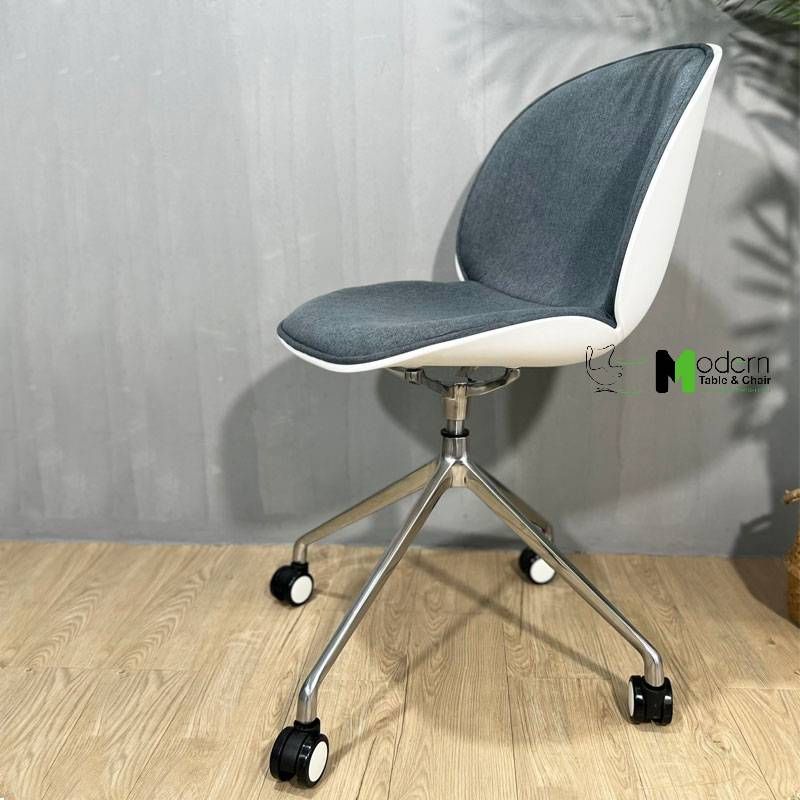 Thiết kế hiện đại: Ghế Beetle 8-F1 với thân nhựa PP trắng và nệm vải bố xám, xanh jean tạo điểm nhấn tinh tế, phù hợp xu hướng nội thất văn phòng hiện đại.