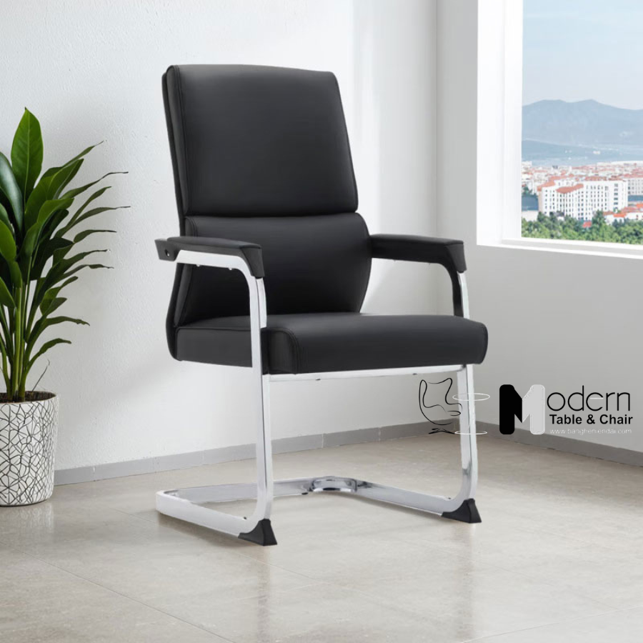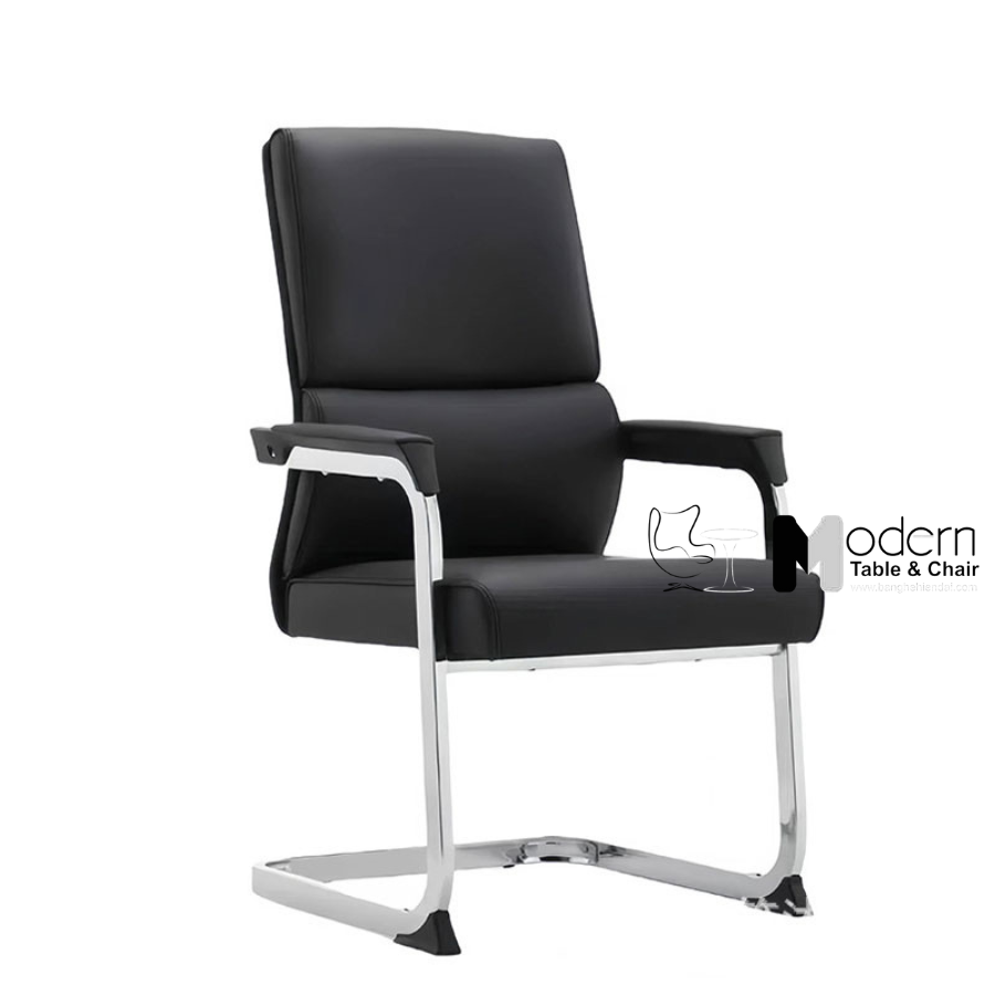 Ghế sử dụng khung chân quỳ bằng thép mạ chrome bóng, tạo cảm giác chắc chắn và tăng tính thẩm mỹ. Thiết kế đầu chân nhọn mang lại cảm giác thanh thoát và hiện đại, dễ phối với nhiều phong cách nội thất văn phòng. Chân ghế không trầy sàn và chịu lực tốt, thích hợp sử dụng trong phòng họp, phòng chờ, khu vực lễ tân hoặc ghế trình ký.
