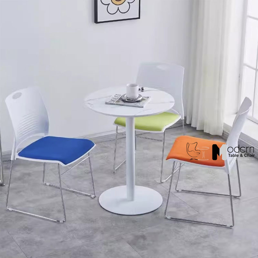 Chất liệu: Khung lưng nhựa trắng, nệm vải, chân thép mạ chrome.