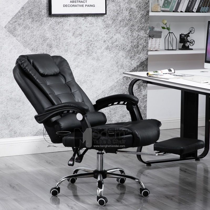 Khung ghế rộng rãi, chắc chắn có độ bền cao nhằm mang đến cảm giác thoải mái, an toàn nhất cho người sử dụng. Phần nệm lưng thiết kế hai lớp dày với kiểu ô vuông có gối kê thư giãn khi sử dụng nghỉ trưa. Tay tựa khung nhựa cao cấp được ốp lớp nệm PVC dày dặn êm ái. Ghế thiết kế ngả lưng 135 độ có thể ngã nằm thoải mái, đặc biệt có máy massage điện 1 điểm trên lưng thư giãn khi nghỉ ngơi. Chân thép mạ chrome chắc chắn, sáng bóng sang trọng.
