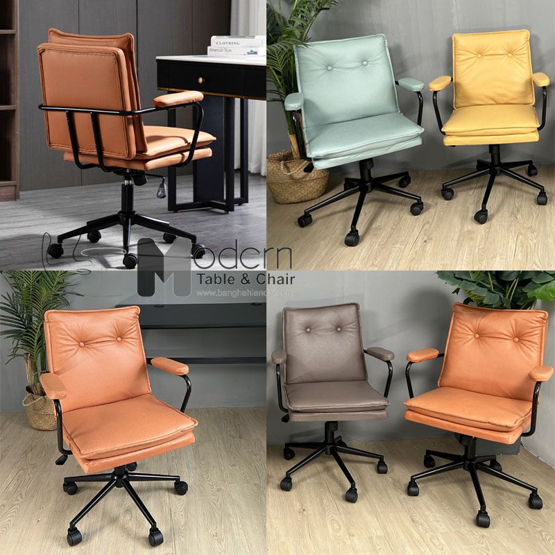 Điểm nhấn ở phần nệm được thiết kế nhân đôi giúp cho phần tiếp xúc dày dặn thoải mái hơn khi sử dụng. Màu sắc bắt mắt dễ dàng phối đa dạng không gian khác nhau như cam, nâu, xanh,vàng bắt mắt và nổi bật. Tay tựa khung sắt ốp PVC êm ái. Chân ghế xoay điều chỉnh linh hoạt độ cao phù hợp với từng kích thước của bàn sao cho thoải mái với tư thế ngồi lâu không gây khó chịu hay đau mỏi. Bánh xe Nylon di chuyển nhẹ nhàng không gây tiếng ồn khi ma sát với mặt sàn. Ghế làm việc tại nhà còn có thể phù hợp cho ghế làm việc, ghế văn phòng, ghế nhân viên lưng trung, ghế nhân viên văn phòng giá rẻ,.....